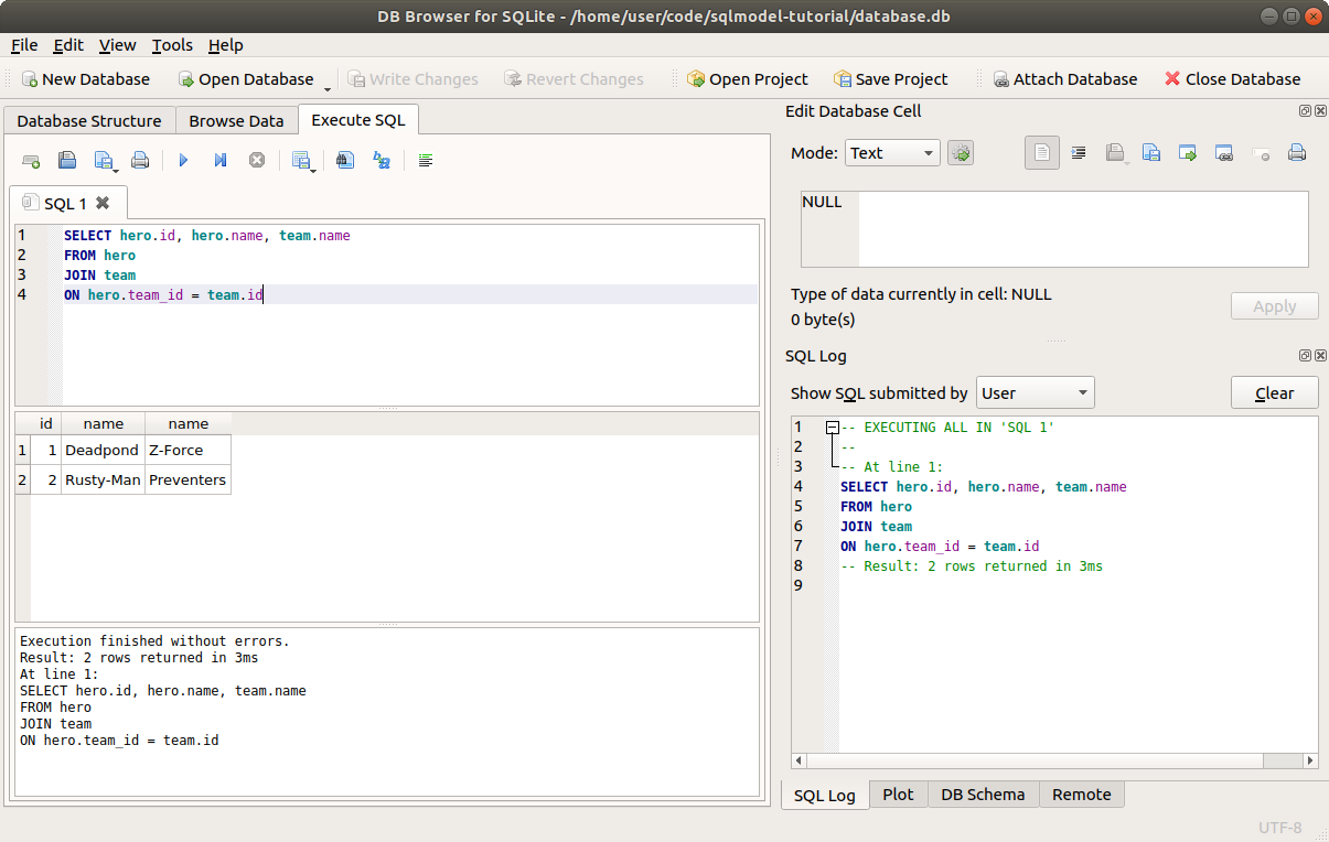 Now let's use SQLModel to do the same select.